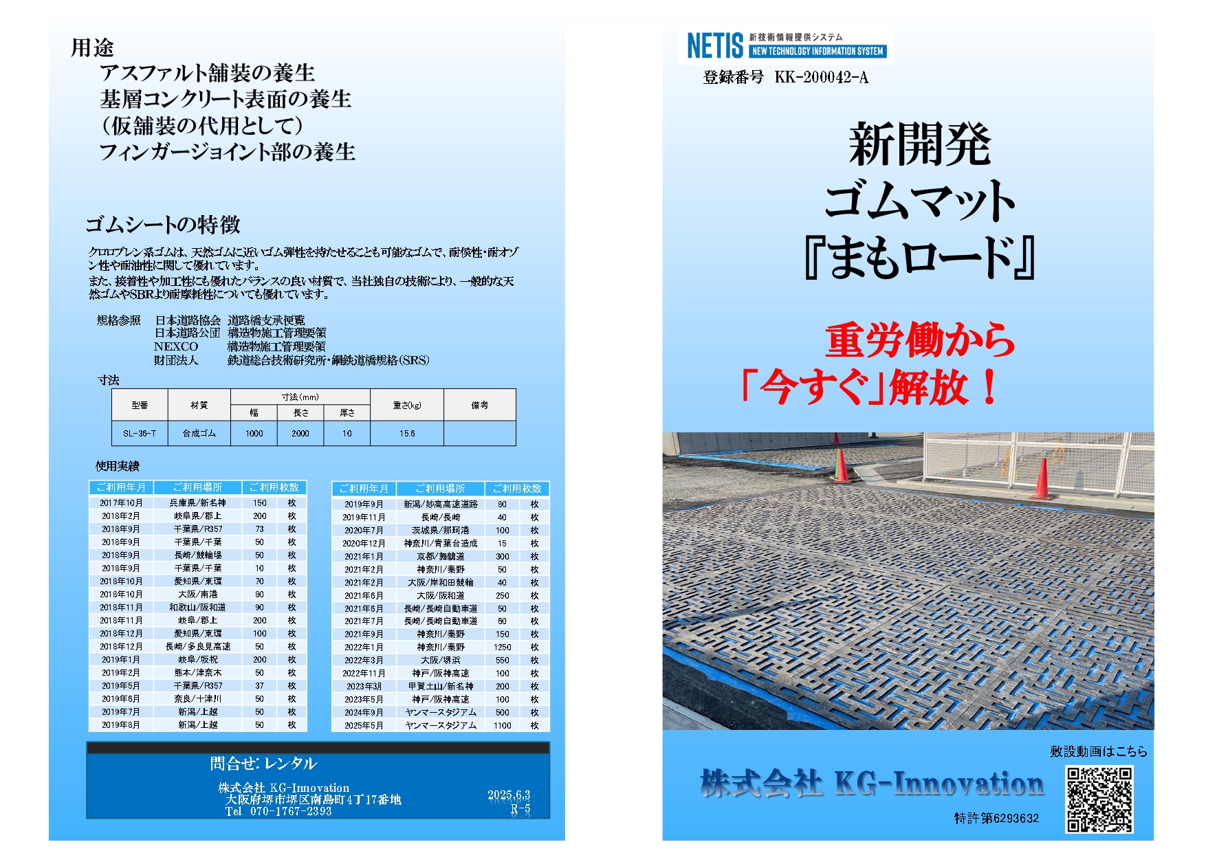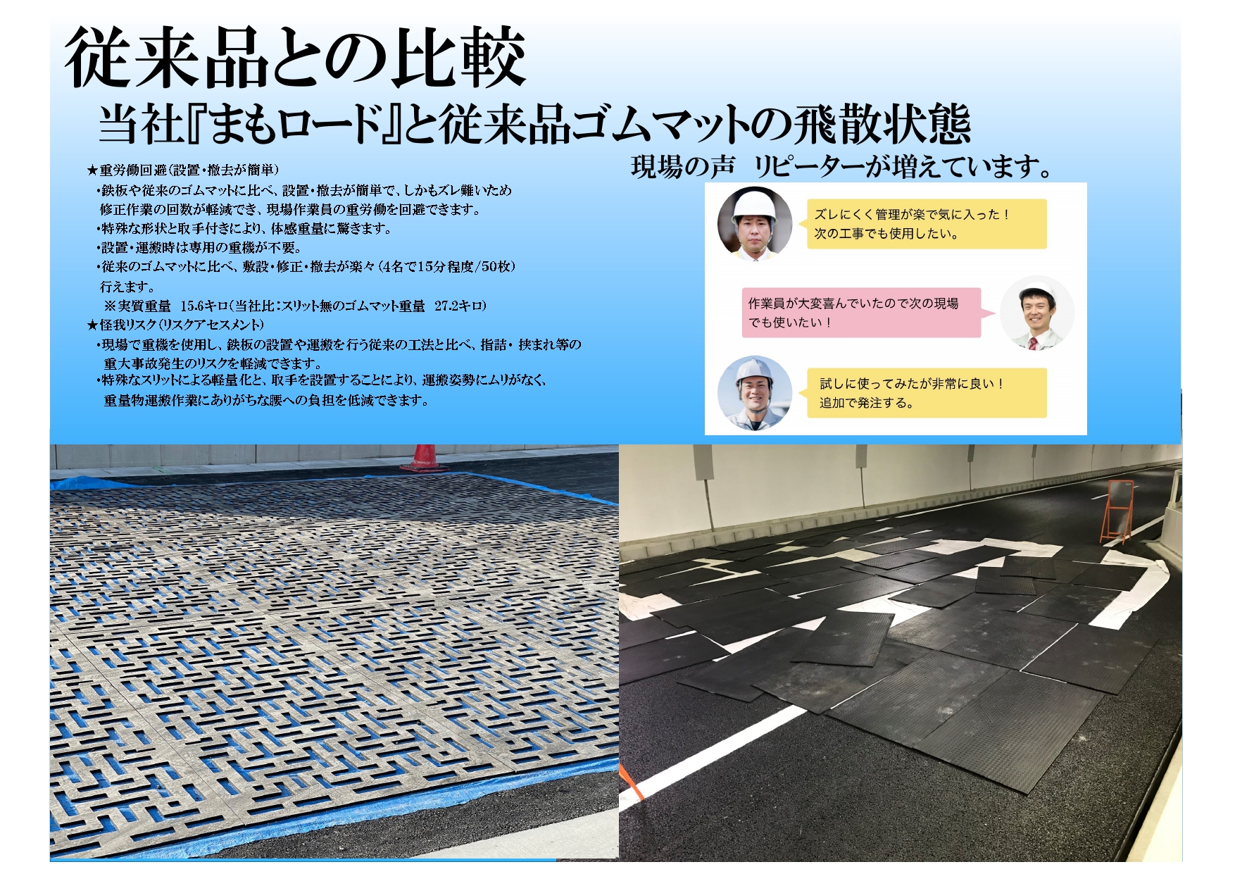 コンクリート基層面またはアスファルト面上での安定性(位置ずれ)をスリットにより改善した養生ゴムマット製品です。本製品の活用により軽量化や走行時のマットずれが軽減されるため、施工性の向上、工程短縮が期待できます。